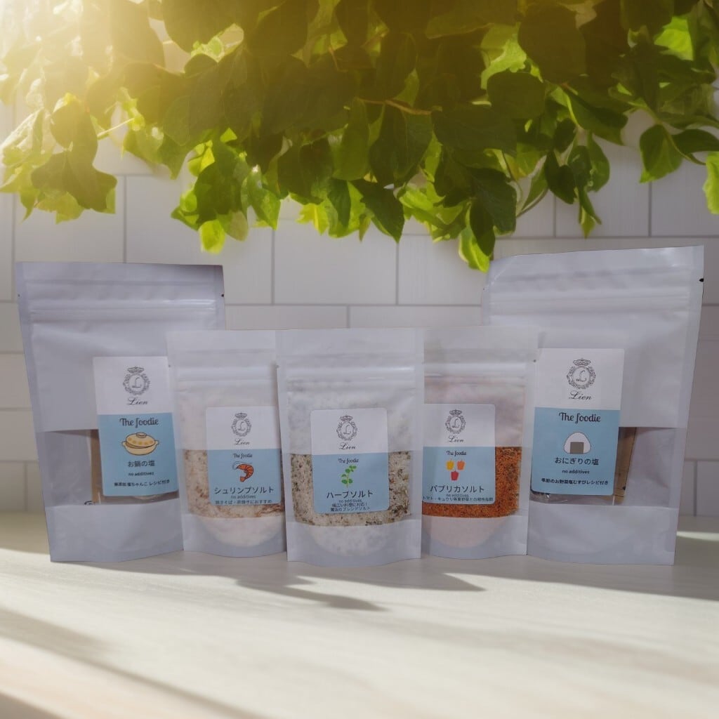 おにぎり塩、お鍋の塩、ハーブソルト、パプリカソルト、シュリンプソルトの5種類がセットになったブレンドソルト。様々な料理に使える。